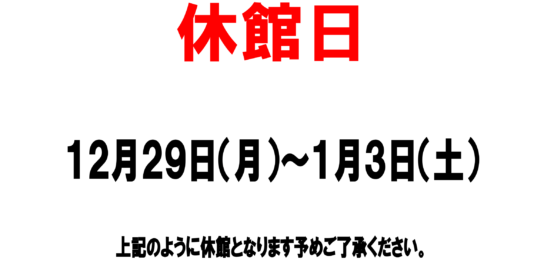 【休館日】 毎週日曜日、12/29(月)~1/3(土) ※1/12(月)通常通り